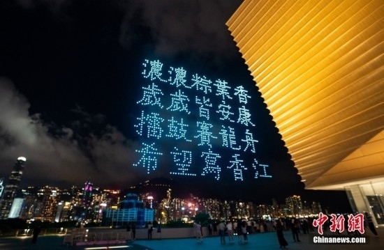 6月22日晚間,“紫荊花之夜”無人機(jī)燈光創(chuàng)意秀在香港故宮文化博物館畔的海面上空舉行,2000架無人機(jī)演繹多個(gè)與“端午節(jié)”相關(guān)的圖案,點(diǎn)亮香港夜空。圖為無人機(jī)組成端午節(jié)寄語。