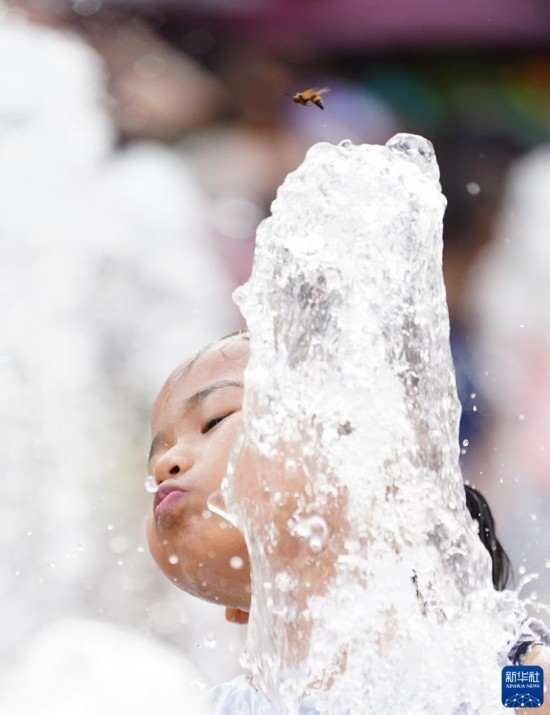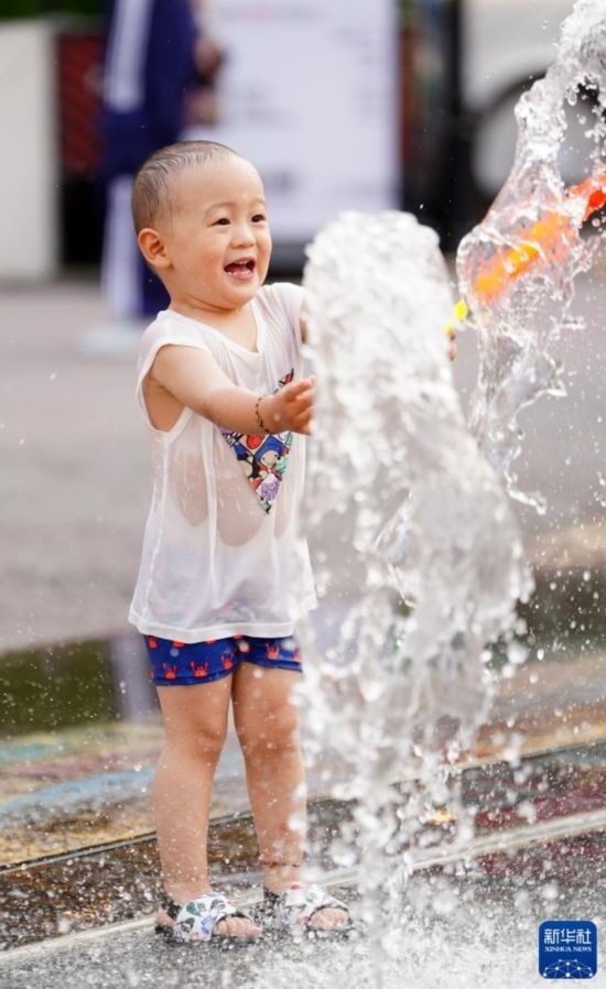 6月23日,小朋友在北京五棵松華熙Live一處噴泉戲水。