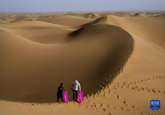 游客在新疆喀什地區(qū)麥蓋提縣N39°沙漠旅游景區(qū)內(nèi)準(zhǔn)備體驗(yàn)滑沙(9月7日攝)。