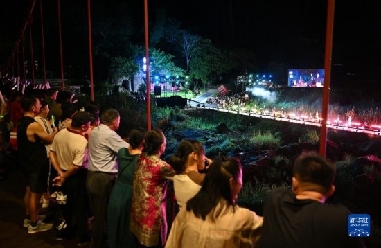 9月16日,觀眾在舞臺(tái)附近的一座橋上觀看表演。