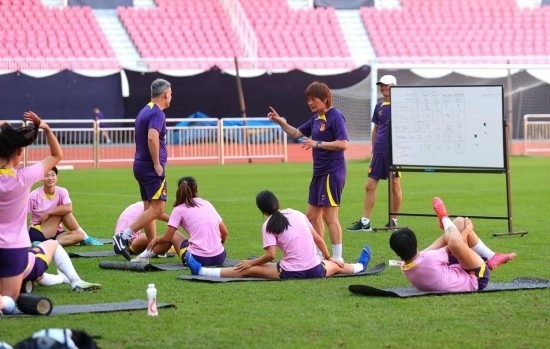 7月5日,中國女足主教練水慶霞(右)在訓(xùn)練中指導(dǎo)球員。新華社記者 丁旭 攝