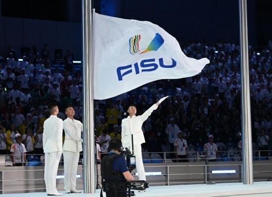 隨后,在國際大學(xué)生體育聯(lián)合會會歌聲中,會旗冉冉升起,迎風飄揚。