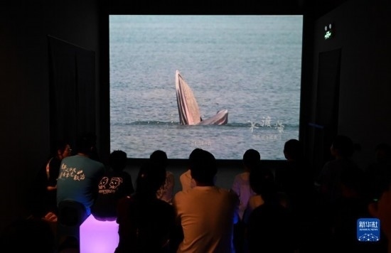 8月26日,游客在國家海洋博物館“鯨奇物語”展區(qū)觀看鯨魚相關(guān)科普視頻。