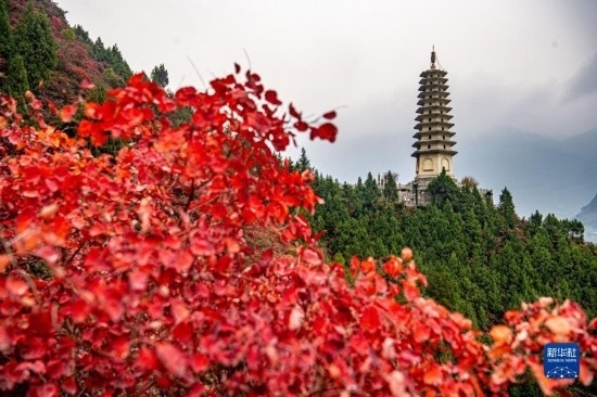 這是11月30日拍攝的紅葉掩映下的長江三峽重慶市巫山縣水域景色。