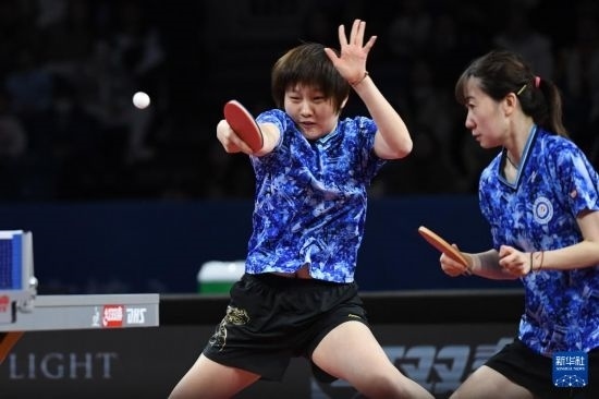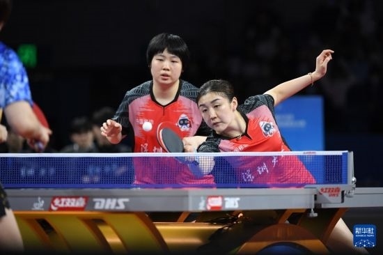 12月22日,深圳大學(xué)隊(duì)組合蒯曼/陳夢(mèng)(右)在女團(tuán)半決賽中。她們以3比0戰(zhàn)勝華東理工大學(xué)隊(duì)組合趙尚/李雅可。最終深圳大學(xué)隊(duì)以總比分3比1戰(zhàn)勝華東理工大學(xué)隊(duì)。新華社記者 梁旭 攝