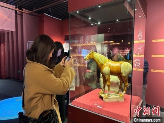 唐墓中的壁畫和彩色陶俑是唐代極具代表性的藝術珍品。記者在展廳看到,女性陶俑類型多樣,各種女坐俑、立俑、侍俑、樂舞俑、騎馬俑、貴婦俑……這些女俑造型生動,尤其是三彩女俑,釉色艷麗,呈現(xiàn)了唐代女性“千人千面”的生存狀態(tài)。