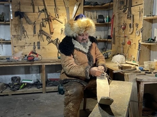 從將軍山滑雪場駕車一路向北,20分鐘左右就到了拉斯特鄉(xiāng)。記者到訪時,69歲的斯蘭別克·沙和什和兒子胡安什別克·斯蘭別克正在作坊里制作毛皮滑雪板。