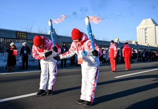 2月3日,在內蒙古呼倫貝爾市滿洲里國門景區(qū),火炬手包玲玲(右)和錢卓在火炬?zhèn)鬟f活動中。新華社記者 連振 攝