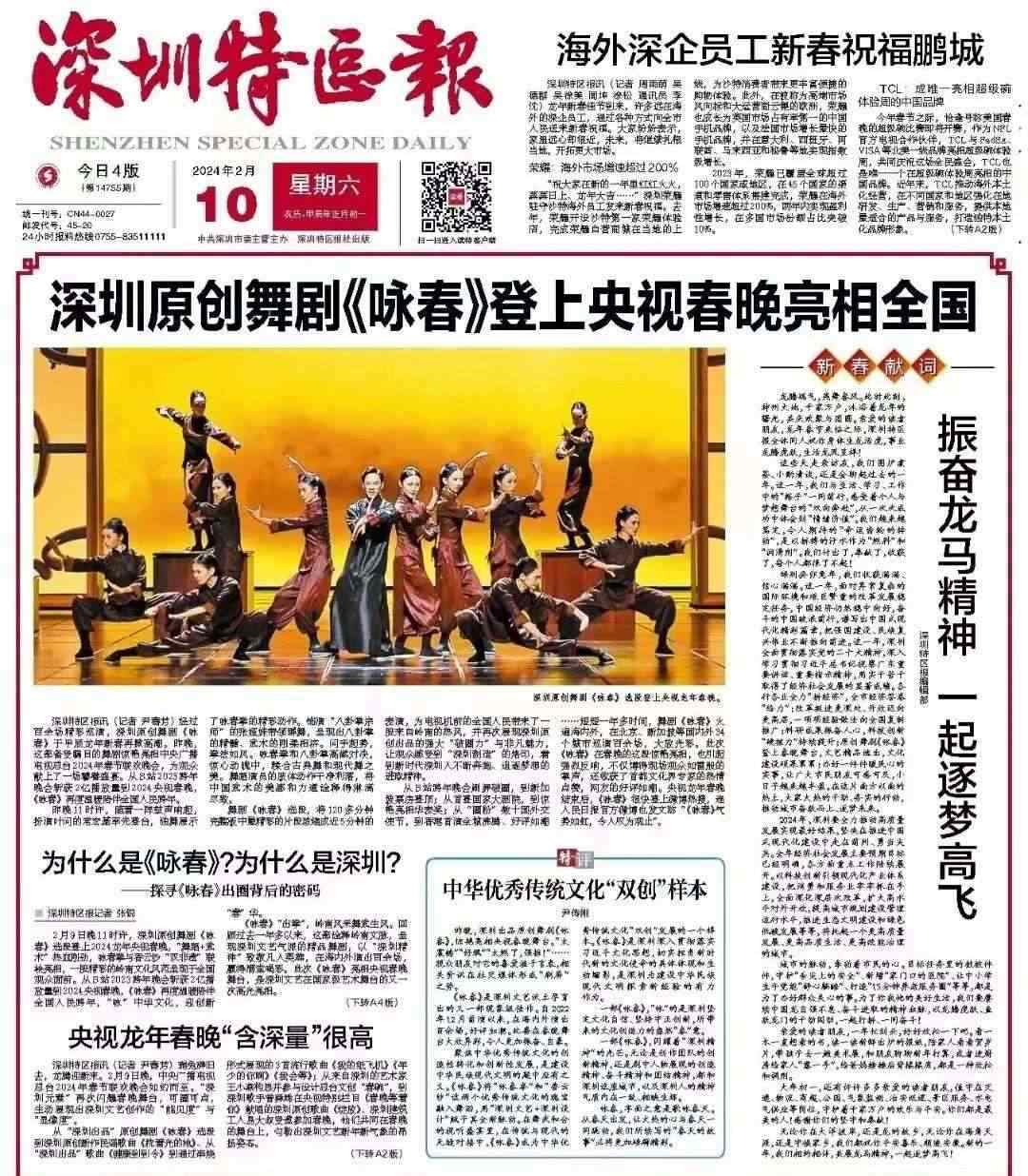 《深圳特區(qū)報》在大年初一頭版頭條對《詠春》做了報道。光明日報原總編輯何東平等首都文化界專家學(xué)者在采訪中紛紛為《詠春》成功登陸春晚大舞臺而點贊。