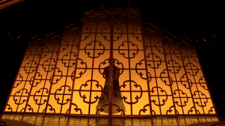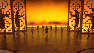 《詠春》來自舞劇《詠春》選段,已經(jīng)上演了百場,但在春晚是個特別的版本。為了創(chuàng)造出更加意蘊(yùn)豐富的想象空間,總臺臺長慎海雄在推薦這個舞劇片段時,提出了幾個建議,包括演員服裝從黑色的香云紗改為絳紅色,男女主角之間的關(guān)系要從男主角一一過招“大敗”女主角改為相互切磋武藝,開場以男主角的武術(shù)剪影來增強(qiáng)吸引力,通過使用剪影效果來展現(xiàn)“葉問”的出場。當(dāng)燈光亮起,窗欞上“詠春拳”三個書法大字淡去,“葉問”的剪影如同舞動的水墨畫一般,隨即演員閃身舞出屏風(fēng),影子與真身共舞。由虛入實,由平面到立體,“剪影”的設(shè)計讓短短半分鐘的獨(dú)舞大大增加了層次感和觀賞性,為空曠的舞臺創(chuàng)造出一個“頂天立地”的葉問之影,視覺震撼瞬間放大,堪稱畫龍點睛之筆。
