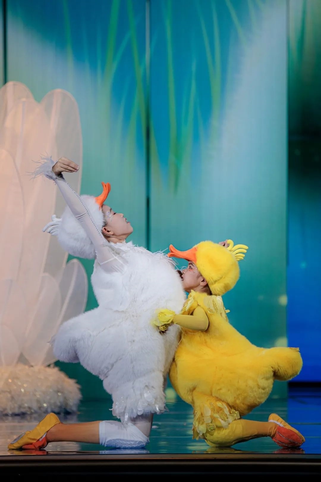 在初始版本中只有“小白鵝”,總臺臺長提出要把孩子們的憨態(tài)可掬呈現(xiàn)得更極致一些,要有幽默感、有劇情感,并建議增加一只“搗亂”的“小黃鴨”。經(jīng)過重新編排,舞蹈一下子有了更多靈氣,“小黃鴨”穿梭在大小白鵝之中,不僅讓整體清冷的色調(diào)增加了一抹暖色,還讓舞蹈內(nèi)容更加豐富,童趣更加飽滿。