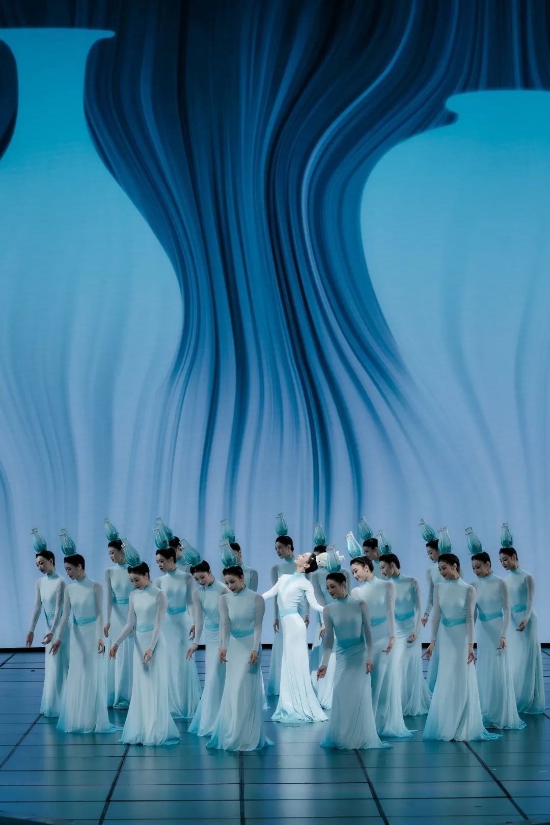 《瓷影》正是以青白瓷為視覺出發(fā)點,演出服裝在色彩上著墨,提取“青”“白”這兩種傳統(tǒng)“正色”,展現(xiàn)出大繁若簡的東方美學(xué)。通過舞者的肢體語言展現(xiàn)青白瓷跨越千年的獨(dú)特魅力。