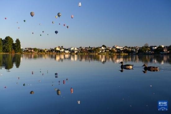 3月20日清晨,放飛的熱氣球經(jīng)過(guò)新西蘭漢密爾頓湖上空。