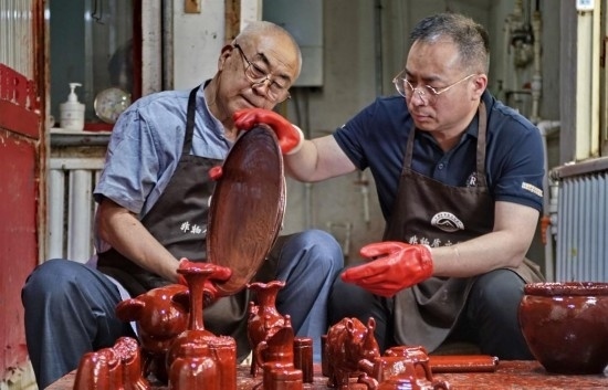 朱江(右)和父親朱慶元在雕漆工作室研究髹漆過程中的問題(5月30日攝)。