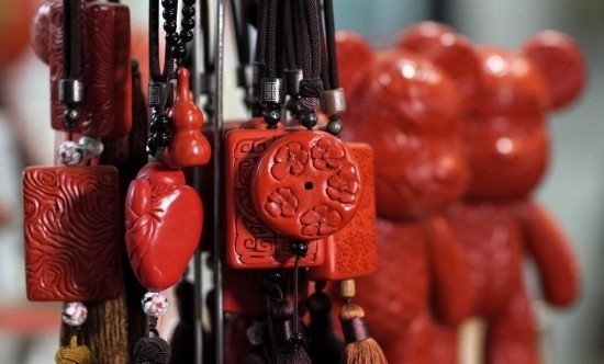 朱江設計制作的適合年輕人的雕漆配飾(6月5日攝)。
