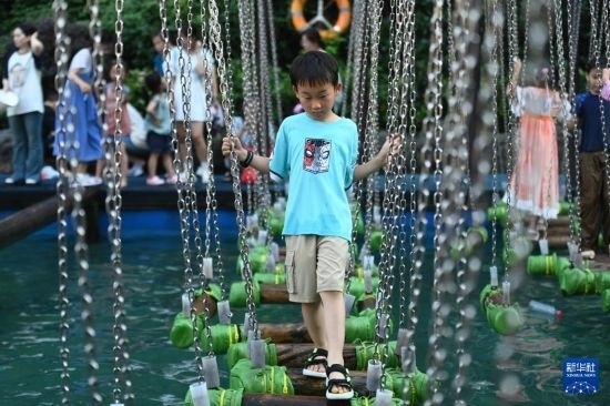 7月5日,小朋友在杭州宋城景區(qū)體驗(yàn)水上游樂(lè)項(xiàng)目。