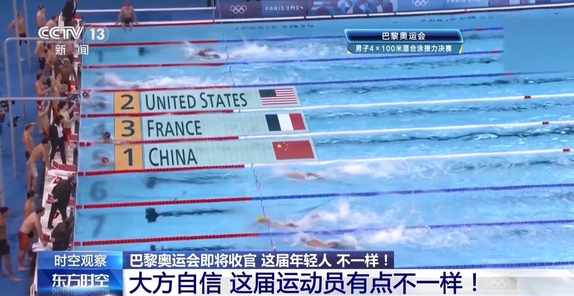 巴黎奧運會游泳賽場最后一個比賽日,中國隊放了個大招。男子4X100米混合泳接力決賽上,中國隊力壓該項目40年“霸主”美國隊,以3分27秒46的成績奪冠。