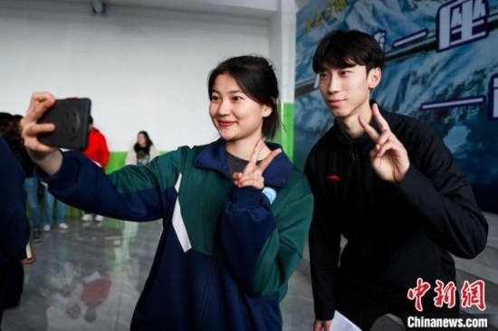 圖為浩門鎮(zhèn)(魯青)高級(jí)中學(xué)學(xué)生與梁育帥(右)尋求合照。薛蒂 攝