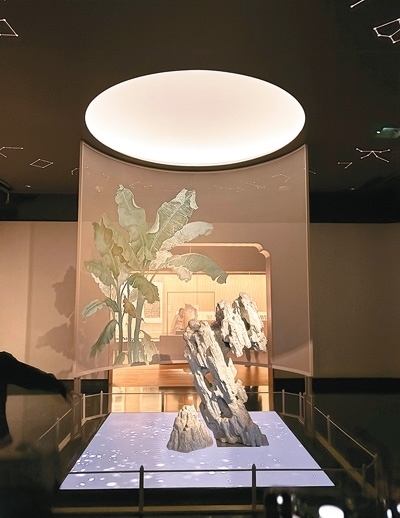 步入上海博物館東館最新開放的“中國(guó)歷代書法”展廳,觀眾會(huì)立刻沉浸于一種雅致、古典的氛圍。序廳正中立著一尊太湖石雕塑,上方的燈光宛如一輪圓月,石后的幕布上繪著一樹芭蕉,石下的LED屏幕顯出一汪碧色湖水,伴著間或響起的水滴聲,蕩起漣漪。