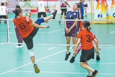 廣東隊(duì)選手李思文(左一)在毽球項(xiàng)目比賽中進(jìn)攻。本報(bào)記者 厲衍飛攝