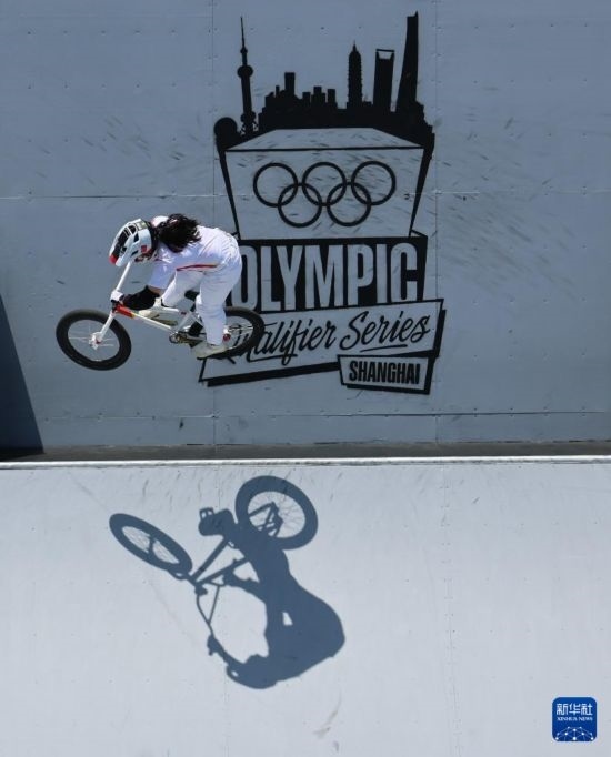 這是2024年5月18日,中國選手鄧雅文在巴黎奧運(yùn)會資格系列賽上海站小輪車自由式女子公園賽決賽中。新華社記者 王楷焱 攝