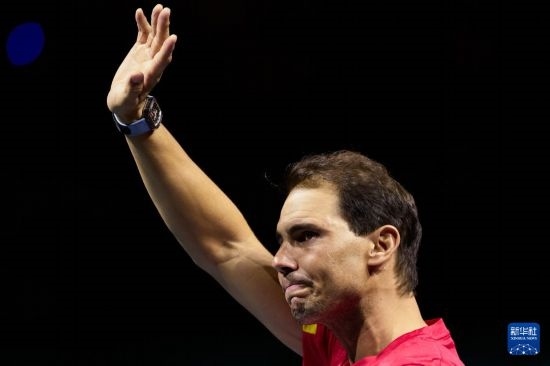 這是2024年11月20日,在西班牙馬拉加舉行的2024戴維斯杯男子網(wǎng)球團(tuán)體賽四分之一決賽后,西班牙隊(duì)選手納達(dá)爾向觀眾致意。新華社記者 孟鼎博 攝