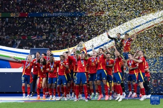 這是2024年7月14日,西班牙隊(duì)在2024歐洲足球錦標(biāo)賽決賽后的頒獎儀式上慶祝。新華社記者 肖藝九 攝