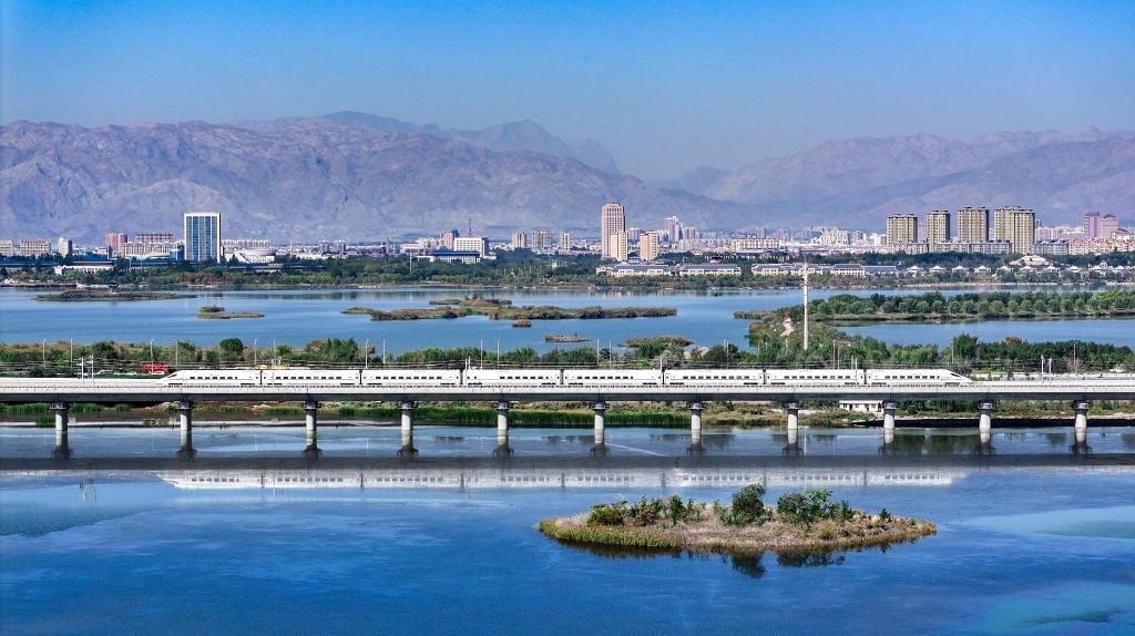 2024年10月3日,一列動(dòng)車組列車行駛在包銀高鐵惠銀段石嘴山特大橋上(無(wú)人機(jī)照片)。新華社記者馮開(kāi)華攝