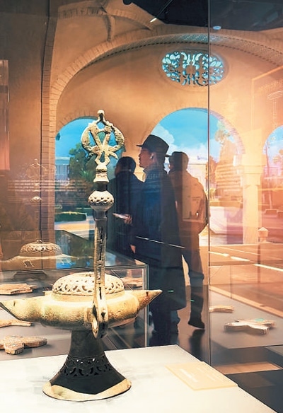 第四部分“剔透耀彩·波斯玻璃器”展示了從阿契美尼德王朝到薩非王朝2000多年間伊朗玻璃生產(chǎn)工藝的變遷。伊朗目前發(fā)現(xiàn)的玻璃最早可追溯到公元前1200年。進(jìn)入阿契美尼德王朝,玻璃器生產(chǎn)迎來繁榮,出現(xiàn)了自由吹制和有模吹制兩大制作工藝。瓶身兩側(cè)裝飾著波浪紋的綠色硅玻璃雙體眼影液瓶、巧妙融合兩種顏色的長頸玻璃瓶醒酒器、用于盛放玫瑰水的花卉紋玻璃壺……琳瑯滿目的玻璃器體現(xiàn)了伊朗人的生活美學(xué)。