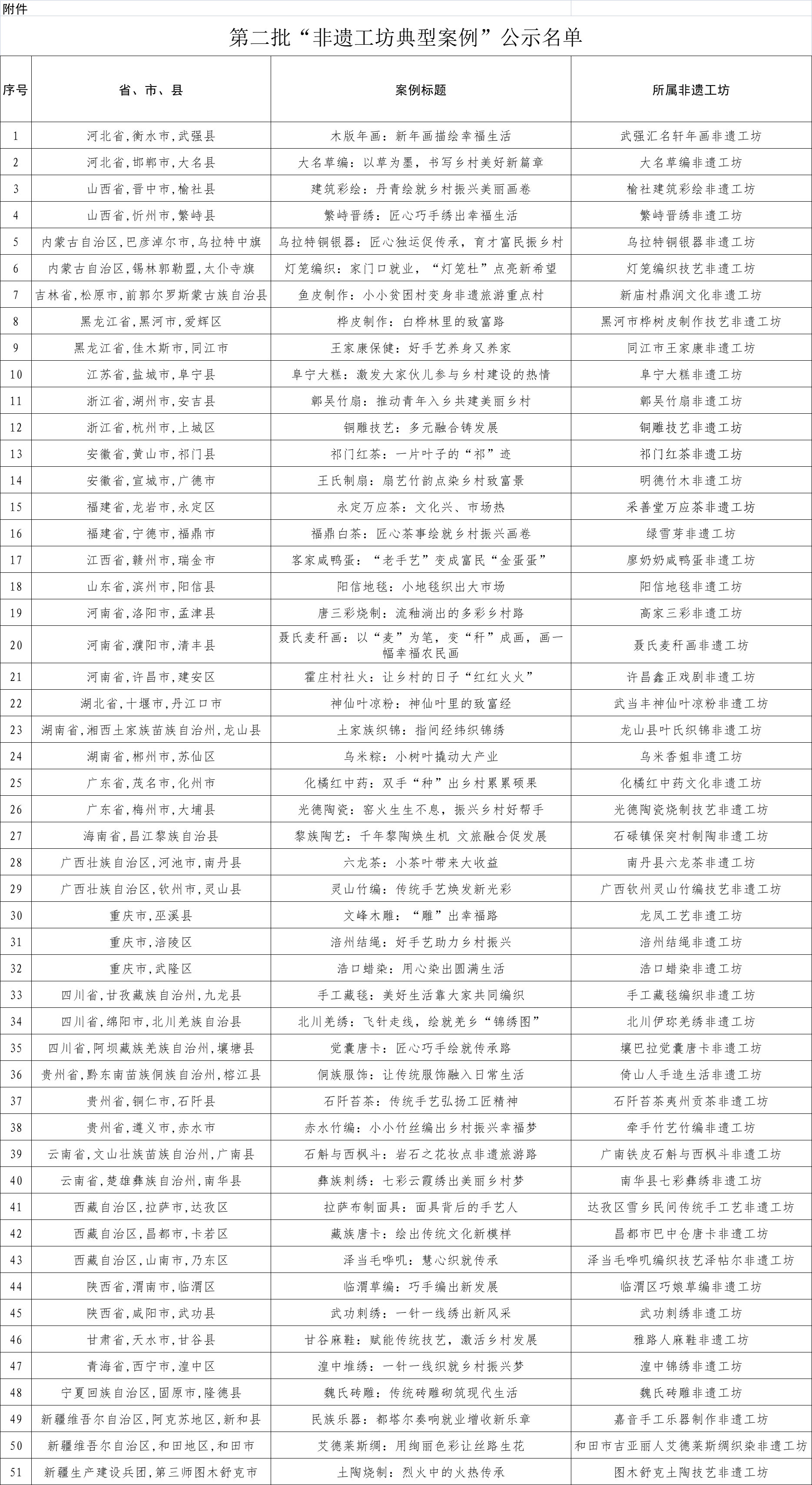人民網(wǎng)北京3月19日電 (記者楊虞波羅)根據(jù)《文化和旅游部辦公廳 人力資源社會(huì)保障部辦公廳 農(nóng)業(yè)農(nóng)村部辦公廳關(guān)于推薦第二批“非遺工坊典型案例”的通知》,經(jīng)各省推薦和專(zhuān)家評(píng)議,第二批“非遺工坊典型案例”推薦和遴選工作于日前結(jié)束。現(xiàn)將推薦名單進(jìn)行公示。