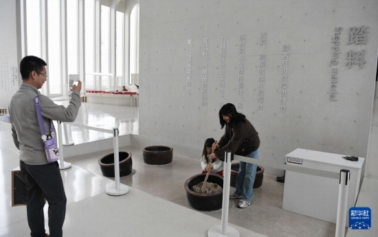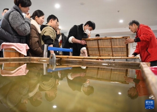 3月15日,游客在涇縣宣紙文化園體驗宣紙?zhí)ち瞎に嚒?/p>