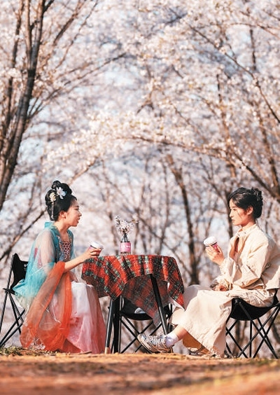 新和村千余畝櫻花絢爛綻放,游客在花海中體驗“村咖”。