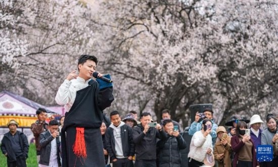 4月3日,歌手在林芝第二十二屆桃花旅游文化節(jié)巴宜區(qū)分會(huì)場現(xiàn)場演唱。