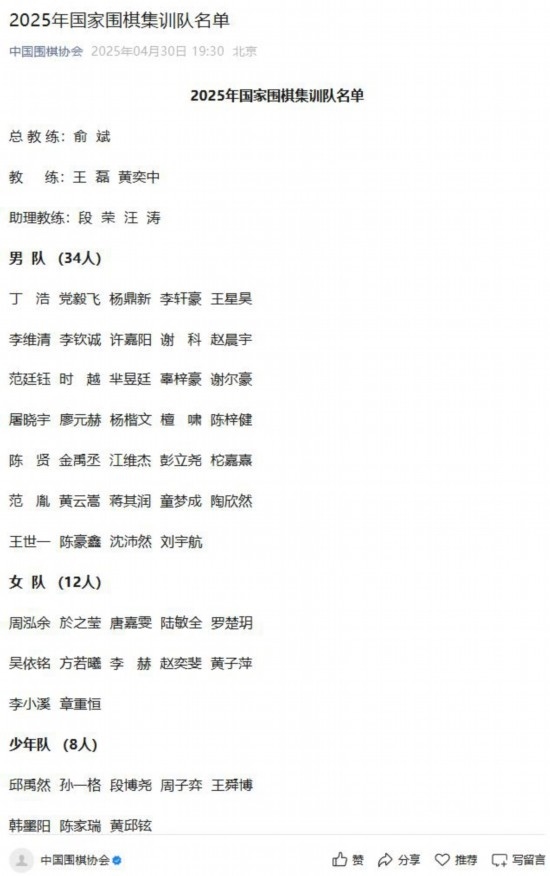 據(jù)國(guó)家圍棋集訓(xùn)隊(duì)選拔小組負(fù)責(zé)人介紹,根據(jù)《國(guó)家圍棋集訓(xùn)隊(duì)運(yùn)動(dòng)員入隊(duì)標(biāo)準(zhǔn)》,報(bào)中國(guó)圍棋協(xié)會(huì)批準(zhǔn),共有54人入選2025屆國(guó)家集訓(xùn)隊(duì)。男隊(duì)由王星昊、丁浩、黨毅飛、楊鼎新、李軒豪、李維清、李欽誠(chéng)等34名棋手組成;女隊(duì)有12人,包括周泓余、於之瑩、唐嘉雯等。此外,國(guó)少隊(duì)還有8名棋手。國(guó)家圍棋集訓(xùn)隊(duì)的教練組由5人組成,俞斌擔(dān)任總教練,王磊、黃奕中擔(dān)任教練,段榮和汪濤任助理教練。
