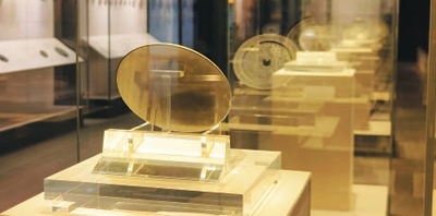 安徽蚌埠市博物館展出的漢代銅鏡。透過(guò)這枚銅鏡當(dāng)前的狀況,依稀能見(jiàn)到過(guò)去鏡面光可鑒人的效果。