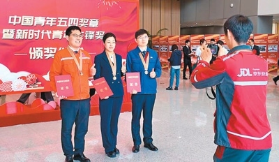 2025年4月30日,中國青年五四獎?wù)卖咝聲r代青年先鋒獎頒獎儀式在京舉行。趙亞杰(中)在頒獎現(xiàn)場合影留念,拍攝照片的是快遞小哥欒玉帥,他也獲得了2025年度中國青年五四獎?wù)隆?/p>