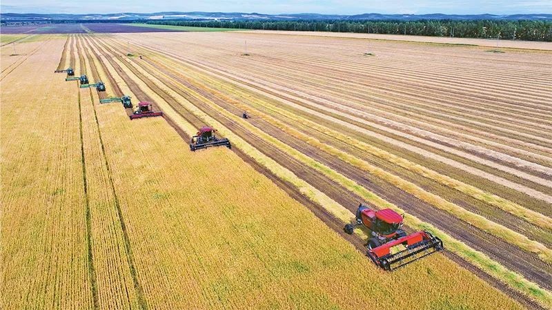 實(shí)施鄉(xiāng)村振興戰(zhàn)略,必須把確保重要農(nóng)產(chǎn)品特別是糧食供給作為首要任務(wù),把提高農(nóng)業(yè)綜合生產(chǎn)能力放在更加突出的位置,把“藏糧于地、藏糧于技”真正落實(shí)到位。圖為2022年8月17日,大型秋收機(jī)械在內(nèi)蒙古呼倫貝爾農(nóng)墾牙克石農(nóng)牧場有限公司第四連(隊(duì))集群割曬作業(yè)。人民圖片王國印/攝