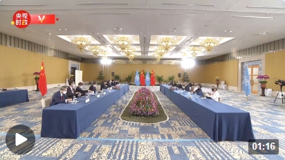 △會(huì)見(jiàn)現(xiàn)場(chǎng)的中國(guó)國(guó)旗和聯(lián)合國(guó)旗幟。(總臺(tái)央視記者荊偉拍攝)