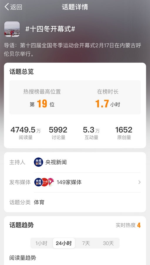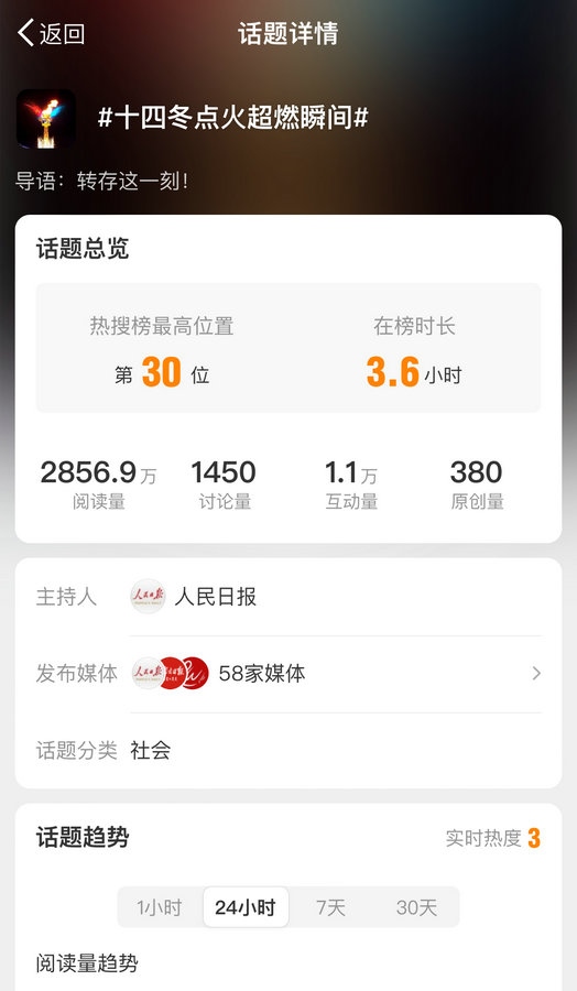 國內(nèi)多家主流媒體對開幕式進(jìn)行報(bào)道,話題#十四冬開幕式# #十四冬點(diǎn)火超燃瞬間#等話題登上微博熱搜榜,閱讀量近8000萬。