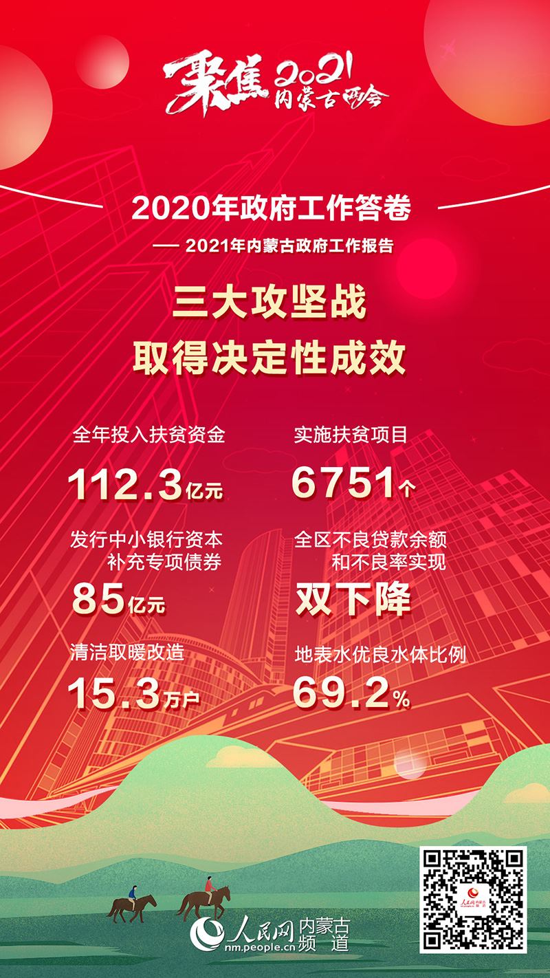 1月26日上午,內(nèi)蒙古自治區(qū)十三屆人大四次會(huì)議在內(nèi)蒙古人民會(huì)堂開幕。自治區(qū)主席布小林作政府工作報(bào)告。2020年是極不平凡的一年,內(nèi)蒙古緊扣全面建成小康社會(huì)目標(biāo)任務(wù),堅(jiān)持穩(wěn)中求進(jìn)工作總基調(diào),堅(jiān)持以人民為中心,科學(xué)統(tǒng)籌疫情防控和經(jīng)濟(jì)社會(huì)發(fā)展,扎實(shí)做好“六穩(wěn)”工作,全面落實(shí)“六保”任務(wù),全區(qū)經(jīng)濟(jì)持續(xù)回穩(wěn),社會(huì)大局和諧穩(wěn)定,“十三五”規(guī)劃順利收官。2020年政府工作有哪些亮點(diǎn)?看內(nèi)蒙古書寫這份精彩答卷!
