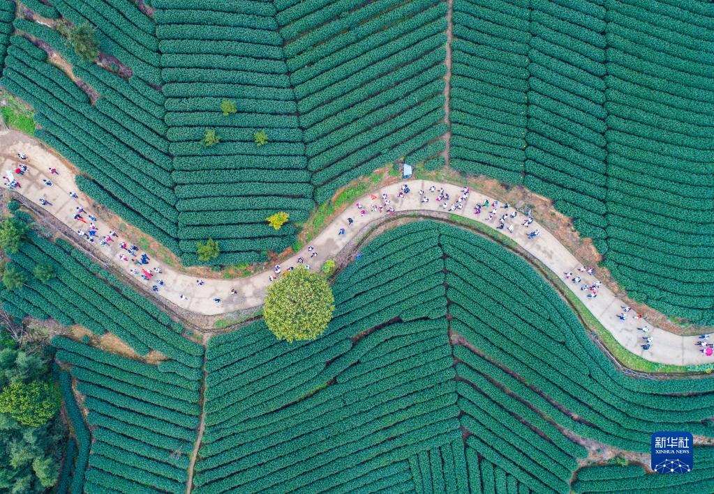 團(tuán)隊(duì)游客在杭州市富陽區(qū)拔山村萬畝茶山游覽(2018年3月26日攝,無人機(jī)照片)。浙江省“千村示范、萬村整治”工程撬動(dòng)了鄉(xiāng)村從美麗生態(tài)到美麗經(jīng)濟(jì),再到美好生活的良性循環(huán)。2018年,浙江“千萬工程”獲得聯(lián)合國“地球衛(wèi)士獎(jiǎng)”中的“激勵(lì)與行動(dòng)獎(jiǎng)”。新華社記者 徐昱 攝