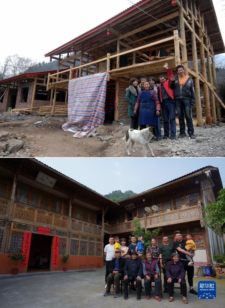 這是一張拼版照片,上圖為四川省綿陽市安州區(qū)高川鄉(xiāng)茅香村群眾林興聰(右二)、李蕓香(右三)和家中的老人、孩子在重建中的住房前留影(2009年1月25日,新華社記者江毅攝);下圖為林興聰(后右三)、李蕓香(后右四)一大家13口人在房前留影(2021年5月4日,新華社記者江宏景攝)。新華社發(fā)