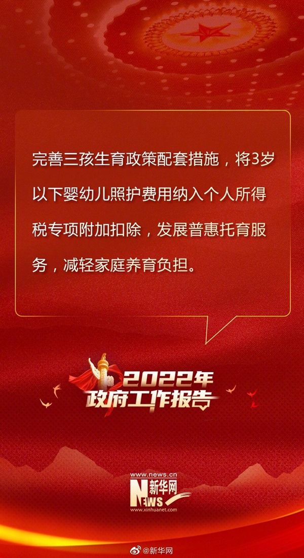 加強(qiáng)社會(huì)保障和服務(wù)。穩(wěn)步實(shí)施企業(yè)職工基本養(yǎng)老保險(xiǎn)全國統(tǒng)籌,適當(dāng)提高退休人員基本養(yǎng)老金和城鄉(xiāng)居民基礎(chǔ)養(yǎng)老金標(biāo)準(zhǔn),確保按時(shí)足額發(fā)放。繼續(xù)規(guī)范發(fā)展第三支柱養(yǎng)老保險(xiǎn)。加快推進(jìn)工傷和失業(yè)保險(xiǎn)省級(jí)統(tǒng)籌。做好軍人軍屬、退役軍人和其他優(yōu)撫對(duì)象優(yōu)待撫恤工作。積極應(yīng)對(duì)人口老齡化,優(yōu)化城鄉(xiāng)養(yǎng)老服務(wù)供給,支持社會(huì)力量提供日間照料、助餐助潔、康復(fù)護(hù)理等服務(wù),鼓勵(lì)發(fā)展農(nóng)村互助式養(yǎng)老服務(wù),推動(dòng)老齡事業(yè)和產(chǎn)業(yè)高質(zhì)量發(fā)展。完善三孩生育政策配套措施,將3歲以下嬰幼兒照護(hù)費(fèi)用納入個(gè)人所得稅專項(xiàng)附加扣除,發(fā)展普惠托育服務(wù),減輕家庭養(yǎng)育負(fù)擔(dān)。強(qiáng)化未成年人保護(hù)。提升殘疾預(yù)防和康復(fù)服務(wù)水平。加強(qiáng)民生兜底保障和遇困群眾救助,努力做到應(yīng)保盡保、應(yīng)助盡助。