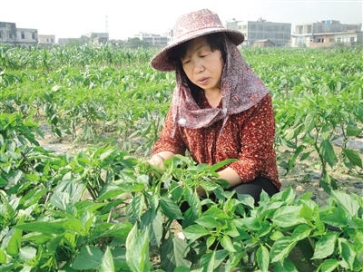 王秀芝在田里查看辣椒長(zhǎng)勢(shì)。