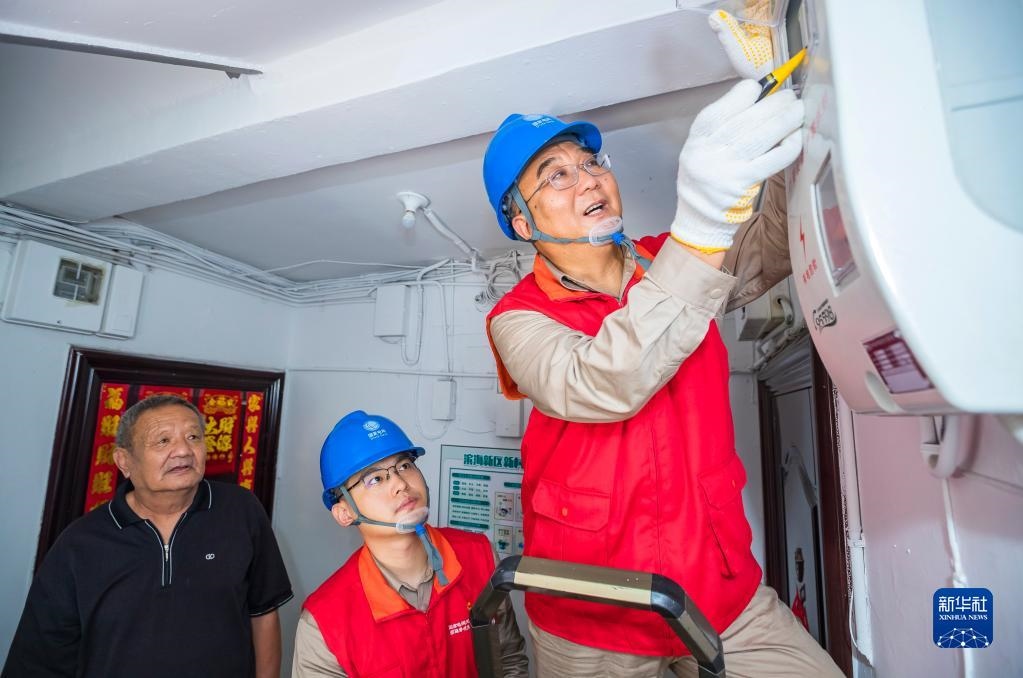 張黎明(右)帶領(lǐng)國網(wǎng)天津?yàn)I海黎明共產(chǎn)黨員服務(wù)隊(duì)到天津市濱海新區(qū)丹東里小區(qū)為居民查看電表(2022年7月15日攝)。新華社發(fā)(李津攝)
