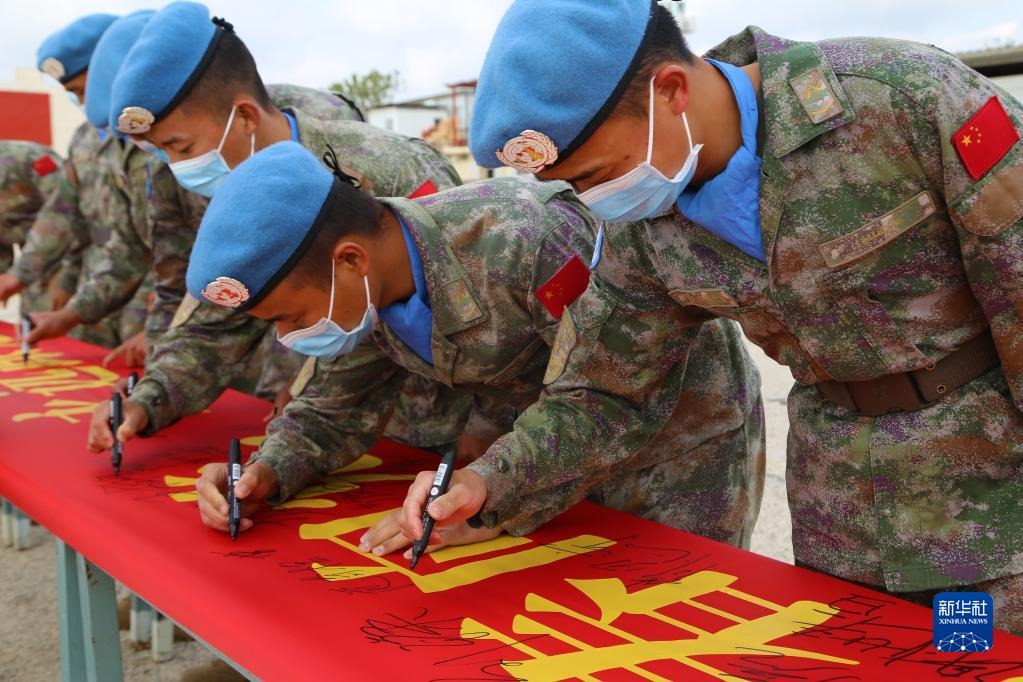 5月1日,在黎巴嫩南部提爾市沙馬村的中國維和營區(qū),中國第20批赴黎巴嫩維和建筑工兵分隊的官兵們在橫幅上簽字。新華社發(fā)(莊小好 攝)