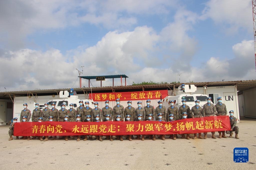 “我宣誓:忠于黨,忠于社會主義,忠于祖國,忠于人民……揚藍盔精神,展大國形象,為祖國爭光,為軍旗添彩。”中國共產(chǎn)主義青年團成立100周年之際,在黎巴嫩南部提爾市沙馬村的中國維和營區(qū),中國第20批赴黎巴嫩維和建筑工兵分隊的官兵們頭戴貝雷帽,身穿配有五星紅旗臂章的星空迷彩服,擺成數(shù)字“100”的隊形,面向國旗和聯(lián)合國旗莊嚴(yán)宣誓。