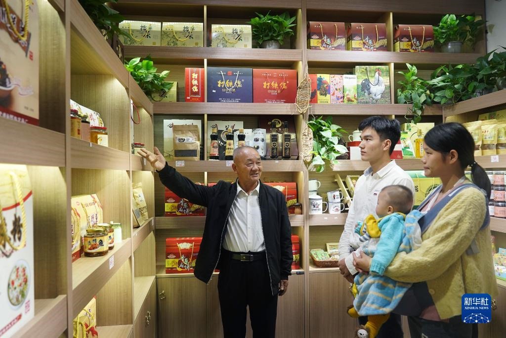 2020年10月21日,江西省贛州市于都縣梓山鎮(zhèn)潭頭村村民孫觀發(fā)(左一)向游客介紹當?shù)氐奶厣r產品。 新華社記者 萬象 攝
