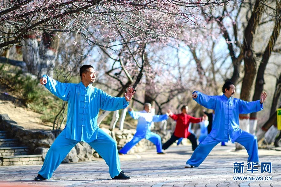 4月3日,健身愛(ài)好者在呼和浩特市滿(mǎn)都海公園的桃花樹(shù)下練太極拳。新華網(wǎng) 發(fā)(王正 攝)