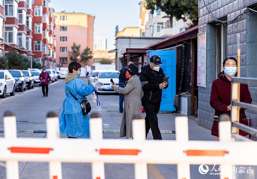 呼和浩特市玉泉區(qū)一處住宅小區(qū),社區(qū)網(wǎng)格員在查驗(yàn)準(zhǔn)備去核酸檢測點(diǎn)居民的健康碼。丁根厚攝 -